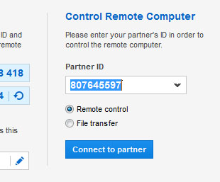 پس از دریافت ID و Password از طرف مقابل، ID را در قسمت Partner ID وارد می کنیم. تیک Remote Control فعال باشد.