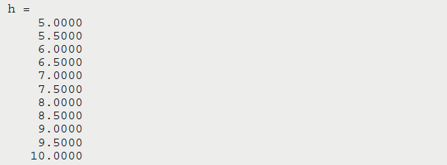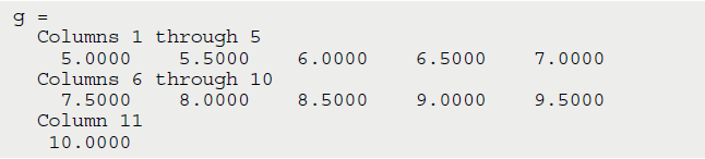 برای امتحان کردن این موضوع، عبارت [g=[5:0.5:10 را در متلب تایپ کنید و کلید Enter را فشار دهید. حاصل به صورت زیر خواهد بود: