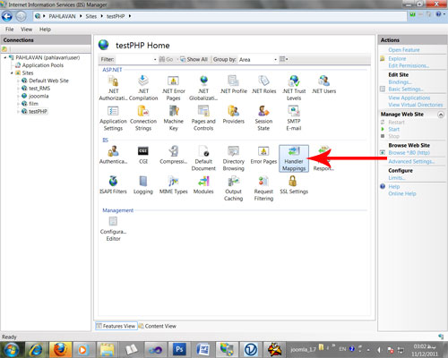 4. نوبت به تنظیمات در IIS میرسه. ابتدا IIS Manager رو اجرا كنید. سرور اصلی رو از لیست Connections سمت چپ انتخاب كنید و از قسمت میانی گزینه Handler Mapping رو دوبار كلیك كنید. این هم عكس: