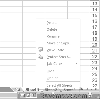 اضافه وحذف یک صفحه کار(Worksheet) برای اینکار کافیست در قسمت پایین صفحه کار برروی هر یک از (Sheet) ها راست کلیک نمود و پنجره ایی بصورت شکل (1) ظاهر خواهد شد.